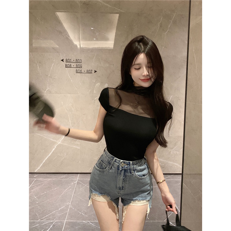Cocory vn Áo Thun Tay Ngắn Cổ Lọ Phối Lưới Thời Trang Mùa Hè Quyến Rũ Cho Nữ