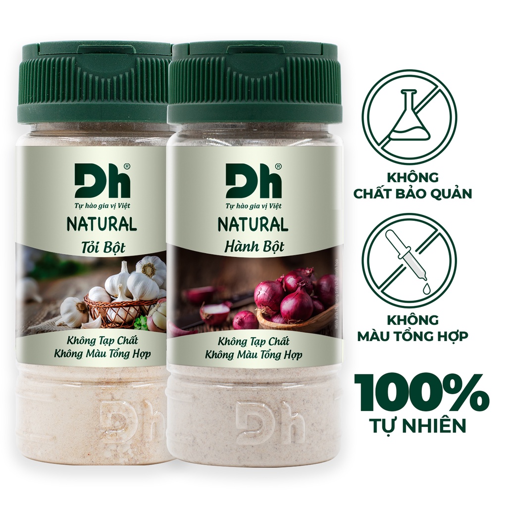 NATURAL TỎI BỘT Tỏi luôn là loại gia vị gần gũi trong bữa ăn hàng ngày của người tiêu dùng. Tỏi Việt Nam có củ nhỏ, nhiều tép cùng mùi thơm tuyệt vời.NATURAL Tỏi Bột Dh Foods được làm từ 100% tỏi tươi Việt Nam, sấy khô và xay mịn. Tiện lợi, tiết kiệm thời gian nấu nướ