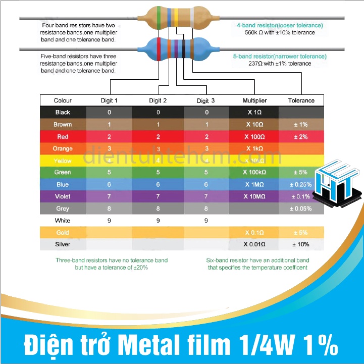 Điện trở Metal film 1/4W 1% 5 vạch màu Điện trở là loại linh kiện thụ động được sử dụng rất nhiều trong tất cả các thiết bị điện tử, mạch điện trong đời sống. Thông số kỹ thuật: Loại điện trở: MF màng kim loại 5 vạch màu Sai số: 1% Công suất: 1/4W Đóng gói: Dây Vạch màu thứ nhất: Chỉ giá trị hàng trăm trong giá trị điện trở Vạch màu thứ hai: Chỉ giá trị hàng chục trong giá trị điện trở Vạch màu thứ ba: Chỉ giá trị hàng đơn vị trong giá trị điện trở Vạch màu thứ tư: Chỉ hệ số nhân Vạch màu thứ năm: Chỉ giá trị sai số của điện trở Xem thêm các sản phẩm khác của shop tại đây: https://shopee.vn/shop/120264079/search *** QUY TRÌNH XỬ LÝ ĐƠN HÀNG ➤ Trong vòng 4-24 tiếng sau khi quý khách đặt hàng thành công, Điện tử HTE sẽ giao cho bên vận chuyển ➤ Nội thành HCM, các tỉnh lân cận thời gian giao hàng từ 1 – 2 ngày. ➤ Các tỉnh thành trong vùng thời gian giao hàng từ 2 – 3 ngày. ➤ Các tỉnh thành miền Trung, miền Bắc thời gian giao hàng từ 3-4 ngày. ➤ Trong thời gian này các bạn giữ máy điện thoại để bưu tá liên lạc giao hàng nhé. Nếu có số gọi nhỡ các bạn gọi lại cho họ nhé *** THÔNG TIN SHOP ĐIỆN TỬ HTE ➤ Shop cung cấp bán buôn bán lẻ toàn quốc các mặt hàng linh kiện điện tử, module, thiết bị, giải pháp cho các ứng dụng điện tử, điện công nghiệp ➤ Chất lượng đảm bảo, hàng có bảo hành cho quý khách yên tâm sử dụng ➤ Nếu cần số lượng lớn vui lòng chat trực tiếp cho Shop hoặc liên hệ : 0945422473 (Có Zalo) THÔNG TIN CẢNH BÁO Sản phẩm yêu cầu người sử dụng có chuyên môn/hiểu biết nhất định về điện, điện tử. Để xa tầm tay của trẻ em. Cấp điện đúng với hướng dẫn, chỉ dẫn để đảm bảo an toàn. Liên hệ nhà bán hàng để được chỉ dẫn trong các trường hợp cụ thể HƯỚNG DẪN SỬ DỤNG Đọc kỹ Hướng dẫn sử dụng kèm theo (nếu có) Liên hệ Nhà bán hàng để được hướng dẫn cụ thể nếu quý khách không rõ cách sử dụng HƯỚNG DẪN BẢO QUẢN Đọc kỹ hướng dẫn bảo quản kèm theo (nếu có) Bảo quản nơi khô ráo, thoáng mát Ngắt hết nguồn điện (kể cả nguồn Pin) khi không sử dụng trong thời gian dài THÔNG TIN LIÊN HỆ VỀ SẢN PHẨM ĐIỆN TỬ HTE HCM - HTE LINH KIỆN ĐIỆN TỬ PRO SĐT: 0945 422 473 Website: www.dientugiahung.com Đ/C: 252/3 Cao Thắng nối dài, Phường 12, Quận 10, Tp.HCM #dientuhte #dientuhtehcm #htelinhkiendientu #linhkiendientu