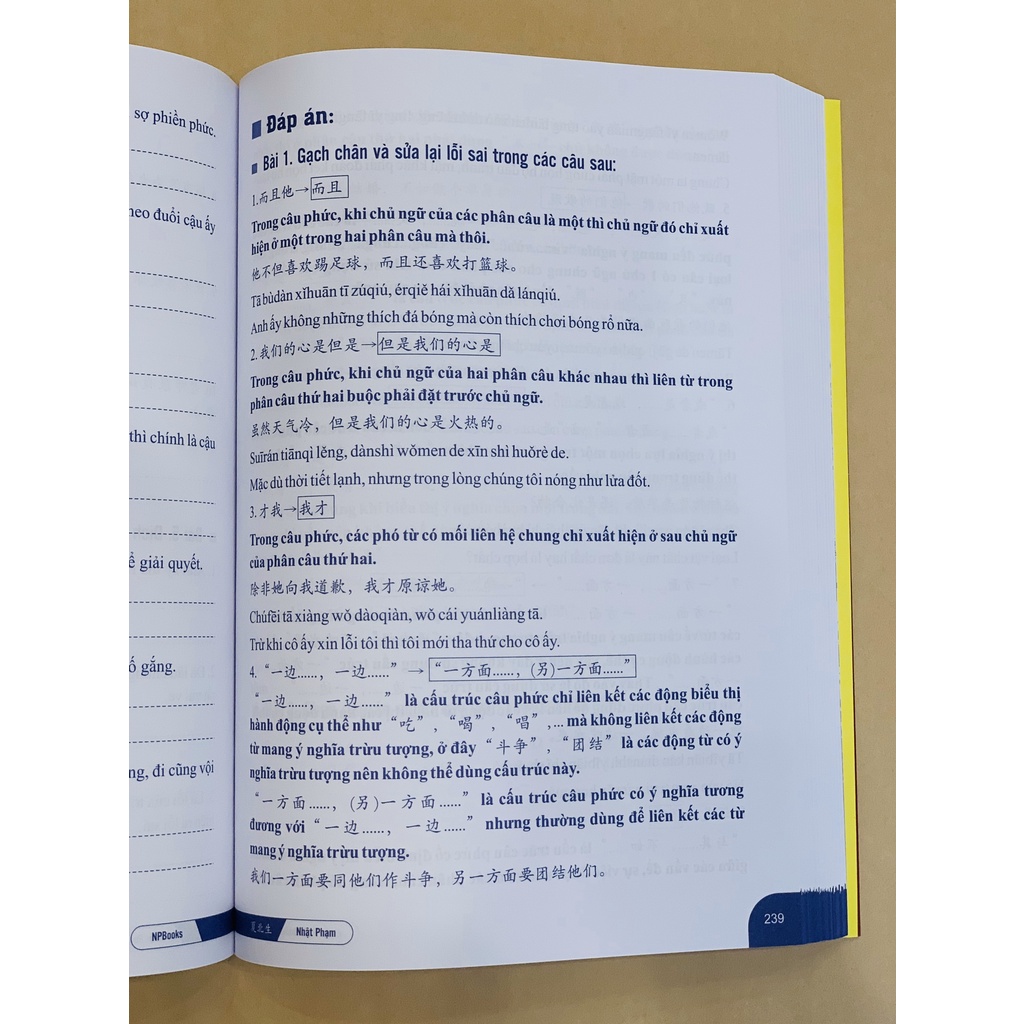 1. SÁCH BÀI TẬP CỦNG CỐ NGỮ PHÁP HSK CẤU TRÚC GIAO TIẾP VÀ LUYỆN VIẾT HSK4-5 Sách phù hợp cho đối tượng từ sơ đến trung cấp muốn ôn luyện và củng cố ngữ pháp HSK1 đến HSK6, nhất là các bạn ôn thi HSK4-5 hoặc muốn cải thiện và nâng cao ngữ pháp, cấu trúc tiếng Trung với phần hướng dẫn luyện đề được bổ trợ thêm cả phần bài tập ngữ pháp siêu chi tiết. Sách được chia làm 2 phần là bài tập ngữ pháp và luyện viết HSK ✅Phần 1: Bài tập ngữ pháp HSK1-6 và cấu trúc giao tiếp 👉Tổng hợp hàng nghìn bài tập về ngữ pháp HSK cũng như ngữ pháp trong các cấu trúc giao tiếp 👉Bài tập đa dạng với nhiều dạng đề khác nhau bao gồm chữa lỗi sai, chọn đáp án đúng, sắp xếp hoàn thành câu, dùng cấu trúc có sẵn để trả lời câu hỏi, dùng cấu trúc cho sẵn để dịch câu 👉Đáp án đầy đủ và giải thích chi tiết, cực kỳ dễ hiểu cho người tự học ✅Phần 2: Luyện viết HSK4-5 👉Hướng dẫn tư duy làm đề, các dạng cấu trúc khó thường gặp trong đề viết HSK4 và HSK5 👉Luyện đề đa dạng với 80 đề viết khác nhau của HSK4-5 được lấy từ ngân hàng đề thi HSK thật. 👉Có đáp án chi tiết và tư duy giải đề cho mỗi đề viết khác nhau cực kỳ dễ hiểu và áp dụng 👉Tỷ lệ trúng đề cao nhờ được lấy từ kho đề thi thật ĐẶC BIỆT: Sách phiên bản mới 2019 được đổi sang chất liệu giấy tốt hơn, trình bày lại một số phần giúp độc giả dễ dàng hơn trong việc tự học so với phiên bản cũ ✅Sách được kiểm duyệt bởi Hạ Bắc Sinh (chuyên gia ngôn ngữ người Trung) Độ dày: 490 trang NXB HỒNG ĐỨC Năm xuất bản: 08/2019 Tác giả: Nhật Phạm 2. SÁCH PHÂN BIỆT VÀ GIẢI THÍCH NGỮ PHÁP TIẾNG TRUNG HAY SỬ DỤNG SAI (TẬP 1) ✅1. Cuốn sách này tập hợp, lựa chọn ra 201 điểm ngữ pháp mà người nước ngoài thường cảm thấy khó khăn trong quá trình học tiếng Hán, sau đó chúng tôi đi vào trọng tâm phân tích và so sánh. Đối với những điểm ngữ pháp khó, chúng tôi tiến hành phân chia thành các mục nhỏ để quá trình phân tích trở nên dễ dàng hơn. ✅2. Tất cả các mục trong cuốn sách này đều được phân loại và sắp xếp dựa trên “Đề cương ngữ pháp trong giảng dạy tiếng Hán cho người nước ngoài” (Chủ biên Vương Hoàn, Nhà xuất bản Học viện ngôn ngữ Bắc Kinh, năm 1995), song cũng chưa đạt tới mức độ hệ thống toàn diện. Đối với các mục so sánh hai đơn vị ngữ pháp (A & B) có từ loại khác nhau, chúng tôi sắp xếp chúng vào phần từ loại của đơn vị trước (A). Để thuận tiện cho người sử dụng trong quá trình tra cứu, chúng tôi đã đánh dấu phân loại tại phần mục lục. ✅3. Cấu trúc của mỗi mục được trình bày như sau: Các ví dụ điển hình, Đặt vấn đề, Phân tích và so sánh, Bài tập thực hành, đáp án bài tập thực hành (phần cuối sách). ✅4. Cuốn sách này không sử dụng phương pháp thông thường là vừa giải thích vừa đưa ra ví dụ mà tất cả các ví dụ điển hình được đóng khung ngay ở phần mở đầu của mỗi đề mục, chúng tôi hi vọng các bạn có thể học được kỹ năng quan sát các ví dụ, sau đó tự mình suy nghĩ vấn đề, từ đó nâng cao năng lực học tập. Đồng thời chúng tôi cũng hi vọng cuốn sách này sẽ có ích đối với các giáo viên trong quá trình giảng dạy tiếng Hán. ✅5. Để phù hợp với năng lực và yêu cầu của người đọc, các đề mục trong cuốn sách này được biên soạn một cách đơn giản, rõ ràng, dễ hiểu, cố gắng kết hợp nhiều các biểu đồ và hình vẽ. Cách dùng từ trong phần bài tập rõ ràng, dễ hiểu, đồng thời nhằm đáp ứng nhu cầu của một bộ phận người đọc có trình độ tiếng Hán cao, chúng tôi cũng đã biên soạn một số câu hỏi với độ khó tương đối cao, đặt ở cuối mỗi bài tập. Tác giả: The Hougong Nhà xuất bản: Thanh Niên Số trang: 312 trang Khổ: 18cm x 25cm (in 2 màu)