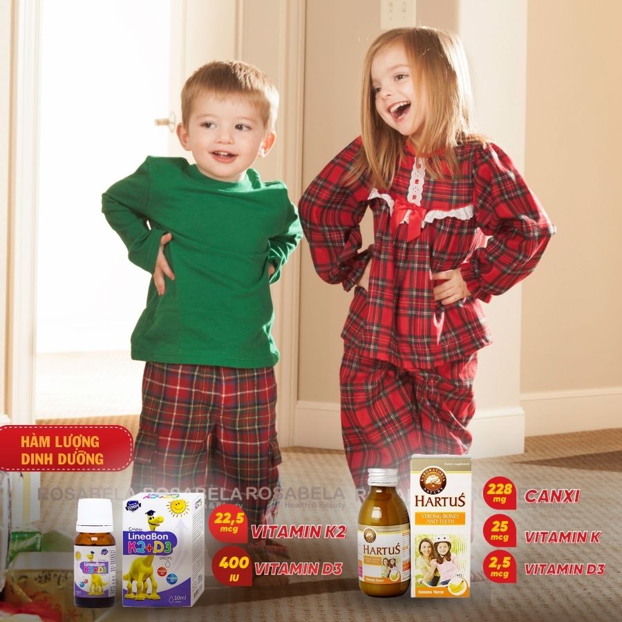 THÔNG TIN SẢN PHẨM COMBO SIRO CHO BÉ BỔ SUNG CANXI, VITAMIN D3 VÀ VITAMIN K2 Tên sản phẩm 1: Hartus Canxi Strong Bones And Teeth Quy cách: Lọ 150ml Giấy phép: 73/2016/ATTP-XNCB Xuất xứ: Balan Nhà sản xuất: Laboratoria Tên sản phẩm 2: Lineabon K2D3 Quy cách: chai 10