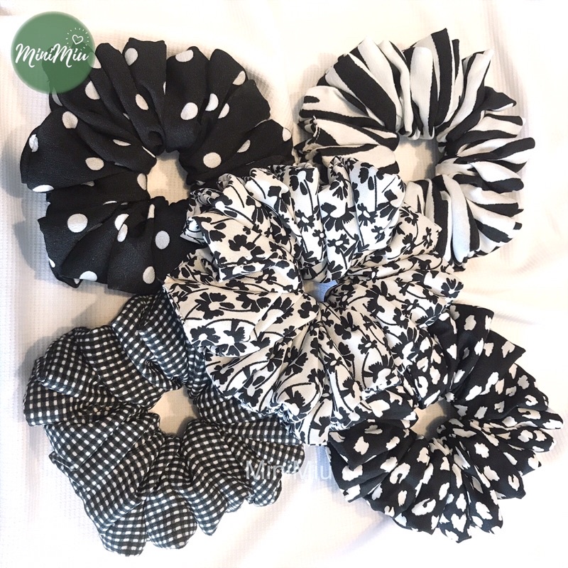 Dây buộc tóc Scrunchies handmade tone trắng đen hoạ tiết, bản rộng 5cm, độ nhún dày chun co giãn tốt