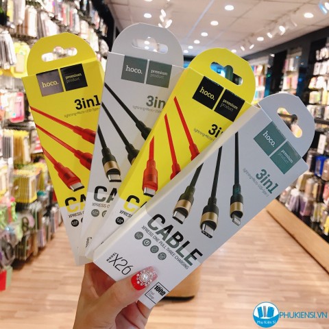 Dây cáp sạc 3 đầu đa năng Hoco X26 3in1 2.4A dây bọc dù chống gãy, hỗ trợ truyền dữ liệu