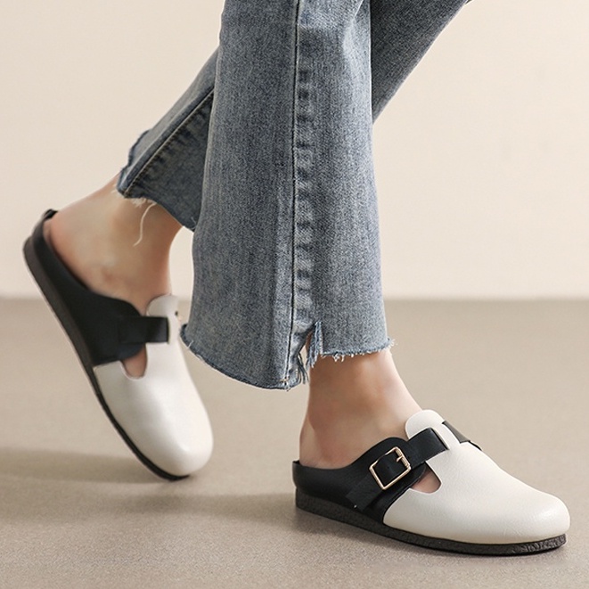 Dép bít mũi quai ngang đế bằng da mềm,dép sục mũi tròn phong cách Hàn Quốc