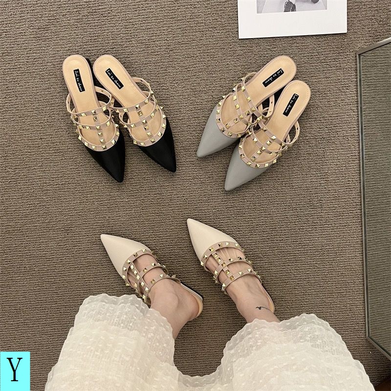 Giày nữ Mới 2022 Thời trang mùa hè Chuỗi kim loại gót thấp Dép mũi nhọn cho nữ