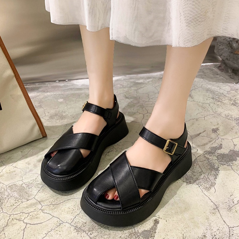 Dép Sandal Nữ Ulzzang LOẠI 1 - Giày Sandal Nữ Đi Học Quai Đan Chéo Màu Đen Chất Liệu Da PU Đế Cao