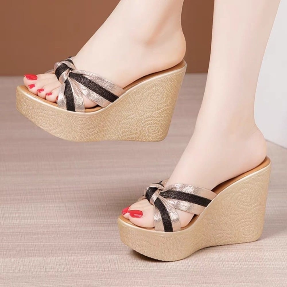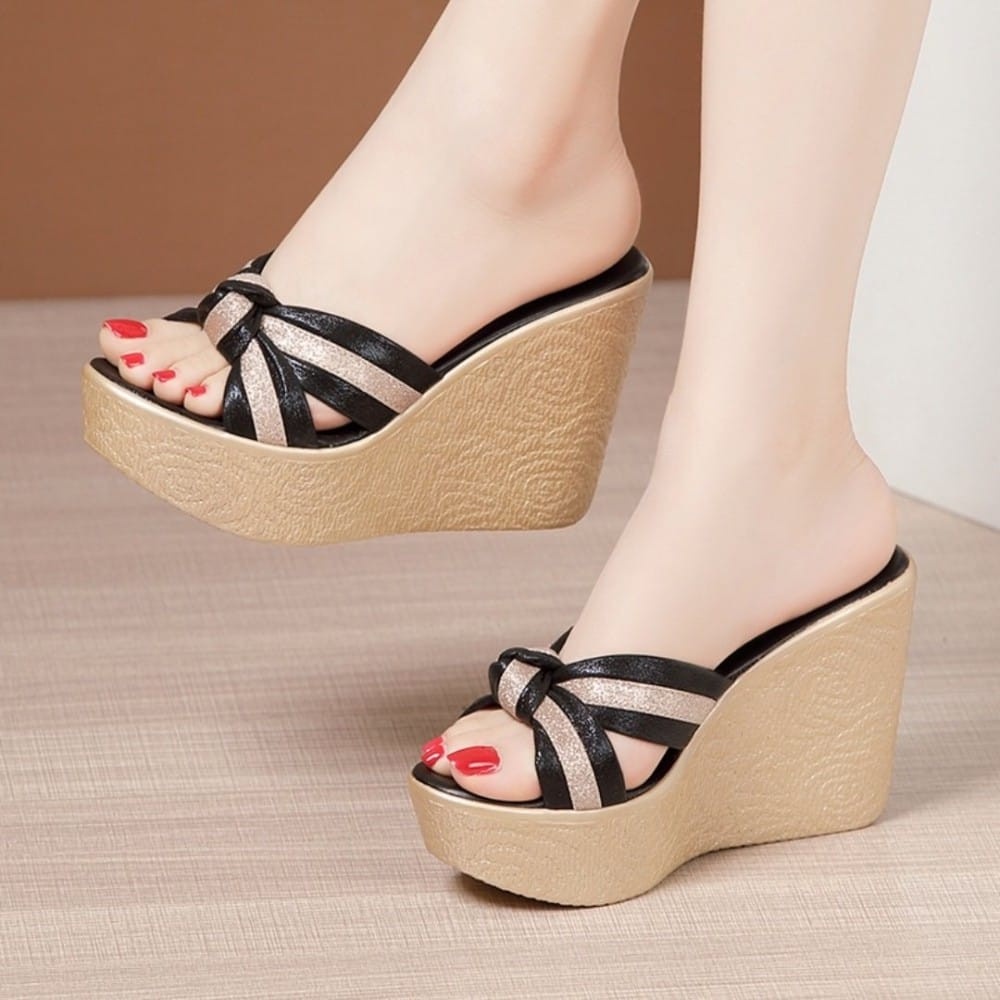 DÉP XUỒNG CHÉO SỌC MẪU MỚI 10P SIZE TỪ 35 ĐẾN 39 CAO 10P MÀU ĐEN, VÀNG ĐỒNG CHẤT DA MỀM ÊM CHÂN. SIZE CHUẨN