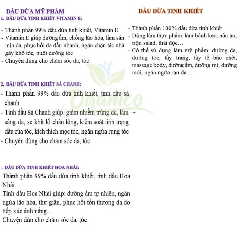 Dầu dừa Hữu Cơ Vietcco Thành phần: 100% tinh dầu dừa nguyên chất được chiet suất theo phương pháp ép lạnh, đây là phương pháp chiết suất cho chất lượng cao nhất với đặc trưng là màu trong vắt như nước tinh khiết. Các loại tinh dầu thông thường sẽ cho màu hơi vàng ho