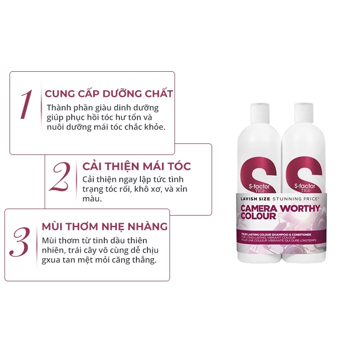 Bộ 2 chai dầu gội xả cao cấp Tigi S Factor Camera Worthy Colour 750ml chính hãng của Mỹ - Phục hồi cấu trúc tóc, giúp tóc bóng mượt, chắc khỏe Dầu gội xả cao cấp Tigi S - Factor trắng với công thức giàu dưỡng chất, chiết xuất hạnh nhân, cây tầm ma, pro-vitamin B5 giúp
