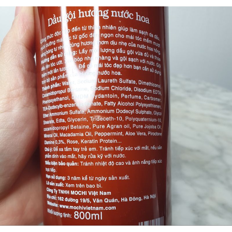 💢Thông tin sản phẩm: . Dầu gội xả hương nước hoa Mochi . Dung tích: 800ml/chai . Phân phối: Công Ty TNHH Thương Mại Mochi Việt Nam . Địa chỉ: 162, đường 19/5 Văn Quán, Hà Đông, Hà Nội 💗Công dụng: Với công thức độc đáo đến từ thiên nhiên giúp làm sạch da đầu, nuôi dưỡ