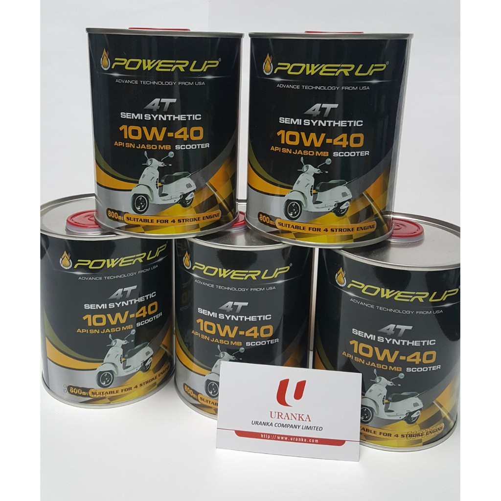 DẦU NHỚT BÁN TỔNG HỢP POWER UP DÀNH CHO XE TAY GA 4T SEMI SYNTHETIC 10W40 API SN JASO MB SCOOTER (DUNG TÍCH) 0.8L NHẬP KHẨU MALAYSIA Thông tin sản phẩm: + Tiêu chuẩn kỹ thuật: API SL, JASO MB + xuất xứ: nhập khẩu trực tiếp từ Malaysia, công nghệ Mỹ + Độ nhớt: SAE 10w