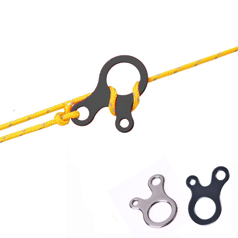 Bind any objects with one rope easily Fit for packing and outdoor activities(sleeping bag, tent, backpack) Material: Stainless Steel Size: 49mm*37mm(1.92*1.45'') Thickness: 25mm(0.98'') Weight: 15gram Color: Silver, Black Package included: 1 * 3-Holes Knotting Tools