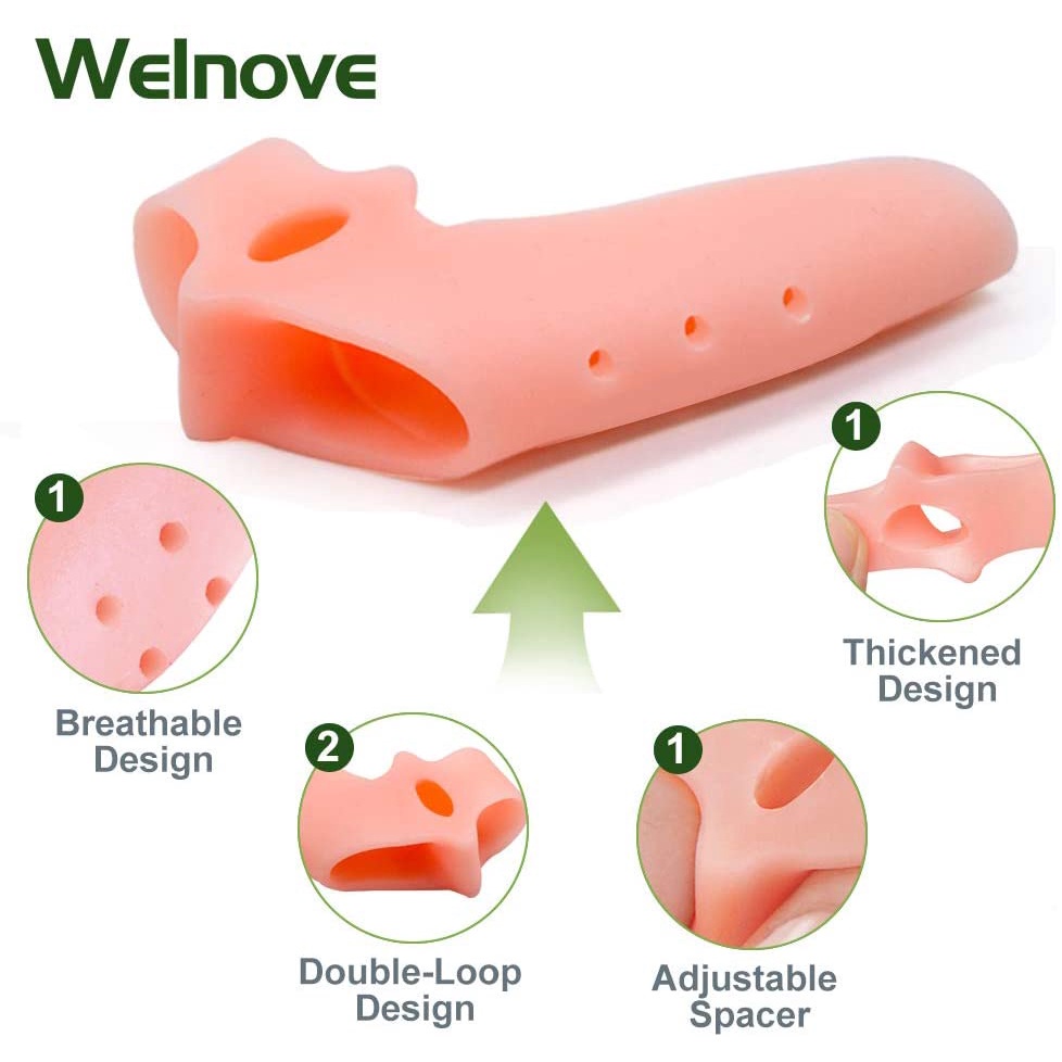 Giữ nguyên vị trí: Thiết kế hai vòng, kết hợp với các đường viền của mép bàn chân, cho phép các tấm tách ngón chân được cố định ở vị trí một cách thoải mái. Thiết kế thoáng khí: Được thiết kế mới lạ, đệm mút có lỗ thở để giữ thông thoáng. Được làm bằng chất liệu dày dặn, không lo lỗ thở bị rách. Bộ đệm ngón chân được điều chỉnh linh hoạt: Thiết kế lỗ rỗng đóng vai trò nhả trục quay. Độ dày khoảng thời gian có thể được điều chỉnh khi bạn cần, chẳng hạn như thêm nhân mềm (Cotton, khăn giấy hoặc silicone mềm, v.v.) vào vị trí lỗ rỗng. Thiết kế đa năng: Bộ bảo vệ bunion có tác dụng tách, đệm và giảm hiệu ứng ma sát. Các ngón chân to và ngón chân thứ hai không chỉ có thể được tách ra mà còn bảo vệ các vết chai, ngón chân búa, ngô và vết chai do ma sát giày, giảm chấn thương phụ cho các ngón chân có vấn đề.