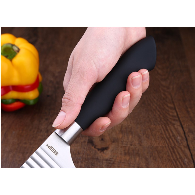 Dao inox mũi bầu lưỡi dao lượn sóng cắt thịt trái cây rau củ tay cầm nhựa đen êm ái khi sử dụng SSGP 32cm
