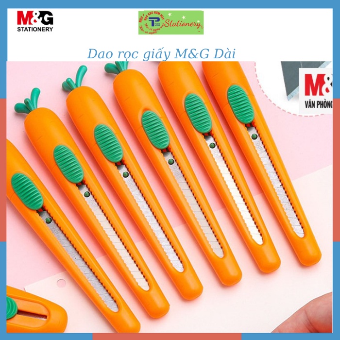 Dao rọc giấy hình củ Cà Rốt M&G ASSN2243/ ASSN2242 mini lưỡi ngắn và lưỡi dài 9mm -Dao dọc giấy là dụng cụ không thể thiếu trong việc đi học và cả đi làm. Vô cùng tiện dụng để rọc giấy, cắt được những đồ vật nhỏ, gọt viết chì..v.v. - Chất liệu: PP + Lưỡi inox sắc bén - Kiểu dáng: Hình củ Cà rốt cute nhỏ gọn thích hợp cho giới trẻ, có thể làm quà tặng - Hình dáng xinh xắn, nhỏ nhắn và tinh tế - Thoải mái và dễ mang theo - Thiết kế dạng lò xo kéo-đẩy để tránh tai nạn - Lưỡi dao sắc bén và bền - Dùng rọc thư, giấy, bưu kiện,.... có thể dùng để trang trí -------------------------------------------------------------------------- "𝗦𝗛𝗢𝗣 [ 𝐕𝐏𝐏 𝐏𝐇𝐔𝐎𝐍𝐆𝐓𝐇𝐀𝐍𝐇 ] Chuyên ngành cung cấp văn phòng phẩm, đồ dùng học sinh, văn phòng Mục đích nhằm phục vụ những KH yêu quý ko có điều kiện mua sắm trực tiếp, VPP Phương Thành chính thức mở kênh online và tự tin phục vụ KH với tiêu chí ""Bán Lẻ Giá Sỉ"".Chúng tôi rất mong nhận được sự hợp tác từ quý KH trên con đường phát triển của ''VppPhuongthanh'' ✔ Quyền lợi và sự thoả mãn của quý khách là tôn chỉ bậc nhất trong phương châm kinh doanh của chúng tôi. ✔ Sản phẩm chính hãng, nguồn gốc rõ ràng và chất lượng đạt tiêu chuẩn. ✔ Shop cam kết về CHẤT LIỆU cũng như HÌNH ẢNH (đúng với những gì được nêu bật trong phần mô tả sản phẩm). ✔Bảo hành theo quy định của nhà sản xuất, hỗ trợ đổi trả hàng cho những sản phẩm bị thiếu, bị lỗi ✔Giá cả hợp lý, cạnh tranh, rẻ nhất thị trường -------------------------------------------------------------------------- 🌐 CÔNG TY TNHH VĂN PHÒNG PHẨM PHƯƠNG THÀNH . 🏠 Địa chỉ: - Cụm CN - Đông Mẫu - Yên Đồng - Yên Lạc - VP ."
