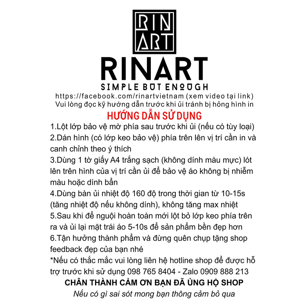 Decal ủi nhiệt | Logo Sticker Patch in áo ủi trực tiếp lên vải - Rinart.vn Decal in áo ủi trực tiếp lên vải ĐẶC ĐIỂM - Sản phẩm thiết kế bắt mắt ép lên được tất cả các loại vải, màu vải - Ứng dụng đơn giản trong ngành thời trang áo thun / Túi sách với nhiều đ