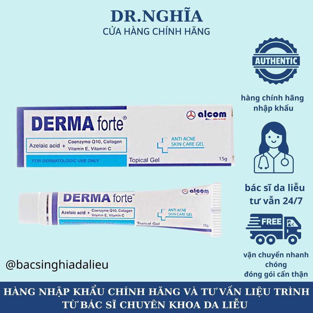 bác sĩ NGHĨA giới thiệu: Derma Forte 15g Sản xuất bởi: Doanh Nghiệp Tư Nhân Sản Xuất Hóa Mỹ Phẩm GAM MA Địa chỉ: 18 Nguyễn Hậu, Phường Tân Thành, Quận Tân Phú, TP Hồ Chí Minh + Xuất xứ thương hiệu: Việt Nam + Thành phần: - Bản thường: thành phần chính Azelaic -