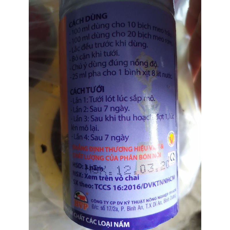 đăng ký kênh cơ sở ngọc bình an tại https://www.youtube.com/channel/UCIQSVpEjvw9TY61Toz9u_6w?sub_confirmation=1 đăng ký thành công shop sẽ tặng mã giảm giá 30% truy cập www.youtube.com/@ngocbinhan HVP 301.N NẤM Hợp chất dinh dưỡng tổng hợp chất lượng cao Hoạt chất N 70gr/L, P2O560gr/L, K20 40gr/L... Quy cách 250ml Công dụng Tăng năng suất 20-30%; nấm rộ, không dộp Hướng dẫn sử dụng Liều lượng + Cách dùng: – Lắc đều trước khi dùng, bỏ cặn khi tưới – 25ml pha 1 bình xịt 8L nước + Cách tưới: – Lần 1: tưới lót lúc sắp mô – Lần 2: sau 7 ngày – Lần 3: sau khi thu hoạch đợt 1, lúc lên mô lại – Lần 4: sau 7 ngày #meonấmrơm , #chấtlượng, #phôinấmbàongưxám, #chấtlượng, #kỷthuậttrồngnấm, #cáchtrồngnấmdễnhất #cơsởnấmngọcbìnhan