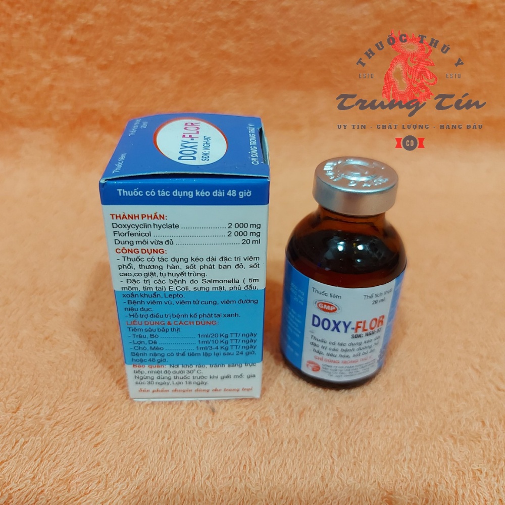- DOXY - FLOR (lọ 20ml) - Điều tr.ị đường hô hấp , tiêu hóa , sốt bỏ ăn - Xuất sứ : Việt nam - Công Dụng : - th.uốc có tác dụng kéo dài đặc tr.ị viêm phổi , thương hàn , sốt phát ban đỏ , sốt cao , co giật , tụ huyết trùng . - đặc tr.ị các bệnh do salmonella (tím mõm , tím tai) E.coli ,sưng mặt , phù đầu , xoắn khuẩn , lepto - bệnh viêm vú , viêm tử cung , viêm đường niệu dục. - hổ trợ điều tr.ị bệnh kế phát tai xanh - Cách Dùng : - tiêm sâu bắp thịt - trâu bò : 1ml / 20kg thể trọng / ngày - lợn dê : 1ml / 10kg thể trọng / ngày - chó mèo : 1 ml / 3-4 kg thể trọng / ngày - bệnh nặng có thể tiêm lặp lại sau 24 giờ hoặc 48 giờ - BẢO QUẢN: - nơi khô ráo , tránh ánh sáng trực típ