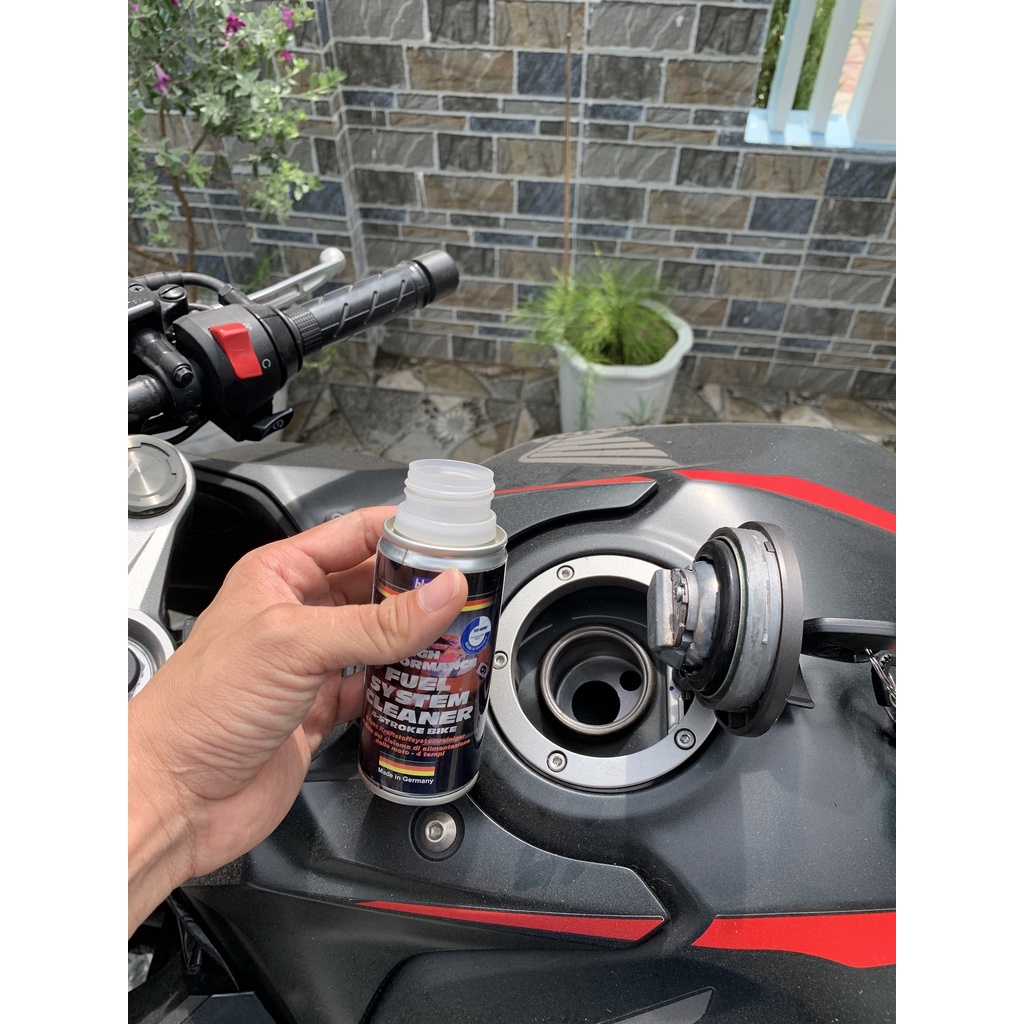 CÔNG DỤNG SẢN PHẨM: - Bluechem Fuel System Cleaner loại bỏ những tạp chất được tạo ra trong quá trình hoạt động của toàn bộ hệ thống nhiên liệu, từ bình xăng đến các béc phun. - Nó loại bỏ các chất bẩn bám dính vào các vòi phun và các van trong bơm, loại bỏ carbon dư thừa trong toàn bộ khu vực xi lanh ở trên. - Loại bỏ nước trong hệ thống xăng. - Bảo vệ toàn bộ hệ thống từ bình nhiên liệu đến béc phun. - Tăng cường bôi trơn trong khi làm sạch. - Kéo dài tuổi thọ của động cơ. - Phục hồi các thiết bị để tối ưu hiệu suất. THÔNG TIN SẢN PHẨM: - Tên tiếng Anh: Bluechem Fuel System Cleaner. - Dung tích: 50 mL - Sản phẩm được cấp chứng nhận TUV về an toàn và hiệu quả. - Nhãn hiệu: Bluechem - Đức. - Sử dụng cho động cơ xe mô tô phân khối nhỏ và mô tô phân khối lớn, tỉ lệ 50 mL cho 8 lít xăng. - ĐỊNH KỲ SỬ DỤNG: Dùng định kỳ 4000 Km hoặc khi xe bị sự cố về xăng bẩn, nhiễm nước . CÁCH SỬ DỤNG: Đổ trực tiếp vào bình nhiên liệu, trong quá trình lưu thông nó sẽ được hòa đều với nhiên liệu và đi đến mọi nơi trong hệ thống từ bình nhiên liệu đến béc phun, nó sẽ hòa tan nước và oxy hóa thành dung dịch đốt cháy được hoàn toàn mà không ảnh hưởng đến nhiên liệu bên trong. LƯU Ý: Chạy hết bình xăng pha với phụ gia Bluechem, sau đó mới đổ xăng chạy như bình thường. #bluechem #vesinhmayxang #vesinhbuongdot #vesinhkimphun #phugianhienlieu #vệsinhkimphunôtô #vệsinhmáyxăng #vệsinhkimphunmáyxăng #vệsinhbuồngđốt #phụgianhiênliệu #phụgiaôtô #vệsinhbuồngđốtbluechem #vesinhbuongdototo #vệsinhbuồngđốtôtô