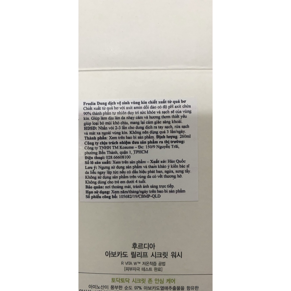 Dung Dịch Vệ Sinh Vùng Kín Frudia Avocado Relief Secret Wash Chiết Xuất Từ Quả Bơ 260ml