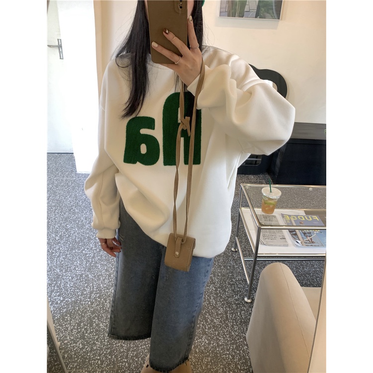 Ethelgirl Áo nỉ thêu chữ phong cách đường phố Mỹ thời trang tay dài cổ tròn dáng rộng