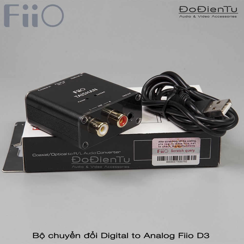 Bộ chuyển âm thanh số (Digital) ra Analog Fiio D3 ( D03K ) Đây là thiết bị chuyễn đổi tín hiệu số (digital) sang analog (chuẩn RCA hoặc AUX 3.5 ) , giải pháp tuyệt vời để chuyển đổi âm thanh kỹ thuật số S/PDIF thường thấy trên các tivi đời mới muốn sử dụng với dàn âm thanh dân dụng chỉ có ngõ analog ( cáp bông sen ) . Với thiết kế gọn nhẹ , năng động và vỏ làm bằng hộp kim nhôm nên không lo nóng trong quá trình sử dụng liên tục Tín hiệu đầu vào : Optical , Coaxial Tín hiệu đầu ra : cổng RCA (đường âm thanh 2 cổng Stereo), 1 cổng ra AUX 3.5mm. Hỗ trợ chuyển đổi âm thanh ở các dải tần từ 32 đến 192Khz ở tần số 24bit. Bên trong hộp có gì : Bộ chuyển đổi Fiio D3 ( D03K ) Cáp USB cấp nguồn 5V chuẩn mini B - A Hướng dẫn sử dụng Thông tin chi tiết: - Nguồn điện: DC 5V - Biên độ đầu ra: 1.6V (0dB Fs) - Đáp ứng tần số: 20Hz ~ 20KHz - Tỷ lệ tín hiệu trên tiếng ồn: ≥90dB - Xuyên âm: 75dB - Tổng méo hài: <0,01% (10mW) - Kích thước: 61,6mm × 49,1mm × 21mm - Trọng lượng: 50g Kích thước sản phẩm (LxWxH): 7x3x6cm; 113 g Kích thước gói hàng (LxWxH): 13x8x4cm; 113 g Youtube sản phẩm : https://youtu.be/PwGzzRH5q2E sản phẩm trên trang chủ cửa hàng : http://dodientu.com.vn/products/bo-chuyen-am-thanh-optical-to-av-fiio-d3-digital-to-analog-audio-converter