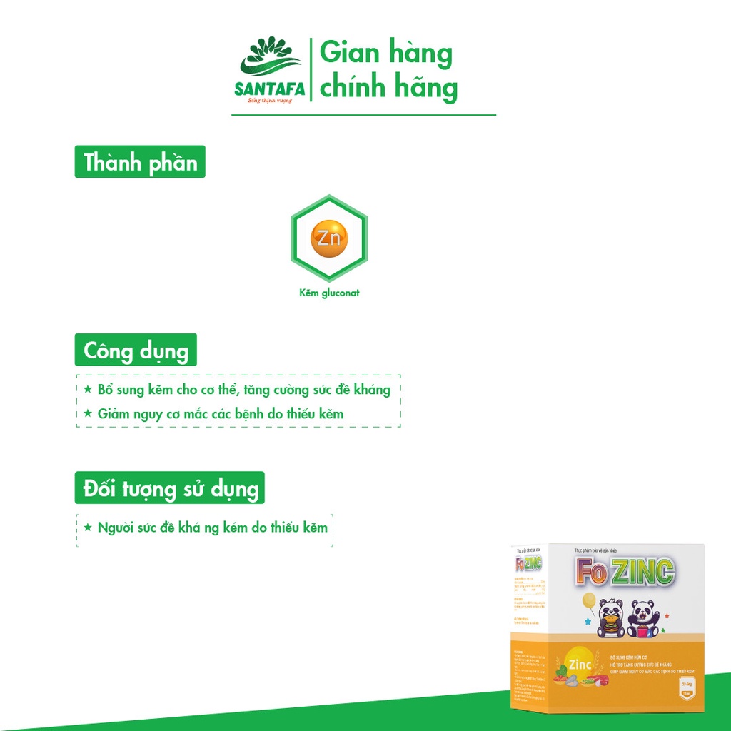 Fo ZinC là thực phẩm chức năng bổ sung kẽm hữu cơ, hỗ trợ tăng cường sức đề kháng, giúp giảm nguy cơ mắc các bệnh do thiếu kẽm. Thành phần: trong 10ml chứa: Kẽm gluconat....................................70mg Phụ liệu: Đường, nước tinh khiết, hương tổng hợp (xoài, dâ
