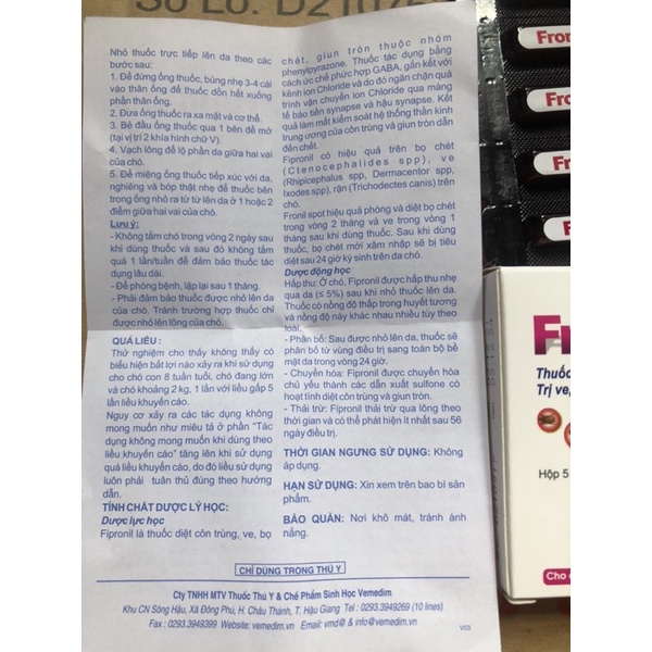 Ống Nhỏ Gáy Fronil Spot Diệt Ve Rận Bọ Chét Cho Chó_ vemedim -1 ống DÙNG CHO CHÓ TỪ 2-10KG CÔNG DỤNG: - Phòng và diệt ve rận, bọ chét trên chó - Sản phẩm duy trì hiệu quả đến 4 tuần đối với ve và bọ chét CÁCH DÙNG: * 1 ống 0.67ml dùng được cho một bé cún trọng lượng từ 2-10kg 1. Để đứng ống nhỏ, búng nhẹ vào thân ống 3-4 cái để dung dịch dồn vào thân ống. Đưa ống ra xa mặt và cơ thể. 2. Bẻ đầu ống qua một bên để mở (tại vị trí 2 khía hình chữ V) 3. Vạch lông để lộ phần da giữa hai vai cún. 4. Để miệng ống tiếp xúc với da, nghiêng và bóp thật nhẹ để dung dịch bên trong ống nhỏ ra từ từ lên da ở 1 hoặc 2 điểm giữa hai vai của chó. LƯU Ý: - Không tắm chó trong vòng 2 ngày sau khi dùng và sau đó không tắm quá 1 lần/tuần để đảm bảo tác dụng lâu dài - Lặp lại mỗi tháng một lần để phòng ve, bọ chét. BẢO QUẢN: Nơi khô thoáng, tránh ánh nắng trực tiếp.