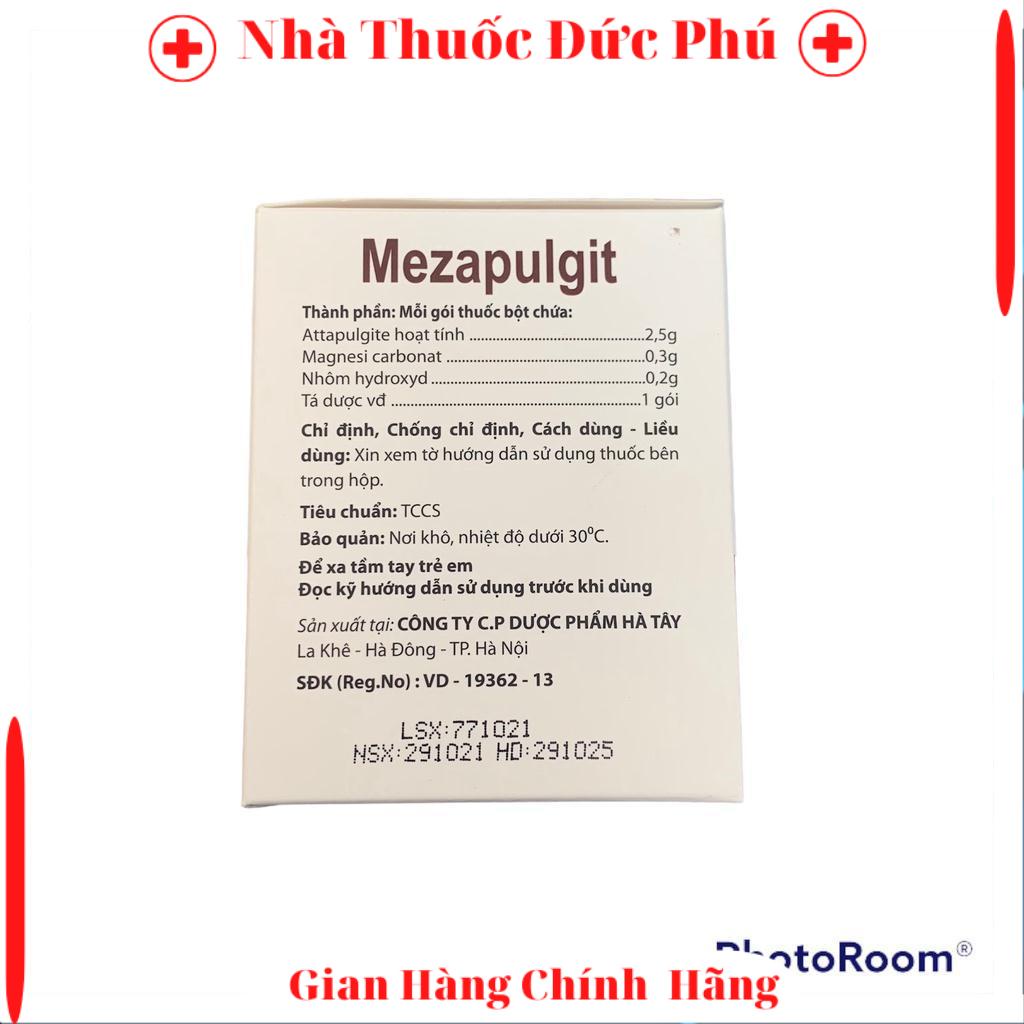 Gói bột pha Mezapulgit hỗ trợ đày hơi, chướng bụng, ăn không tiêu, bệnh đường tiêu hóa - Hộp 30 gói Hộp 30 gói Đọc kĩ hướng dẫn sử dụng trước khi dùng * Thành Phần : Magnesi carbonat hàm lượng 0,3 gam. Nhôm hydroxid hàm lượng 0,2 gam. Altapulgite hoạt tính hàm lượng 2,5 gam. Tá dược gồm methol. glucose, tinh dầu bạc hà vừa đủ 1 gói. Đối tượng sử dụng: đầy hơi, đau bụng, ăn không tiêu, chướng bụng, rối loạn tiêu hóa, hỗ trợ bệnh dạ dày, tá tràng. Bảo quản: nơi khô ráo, tránh ánh sáng Dạng bào chế : bột pha hỗn dịch B .