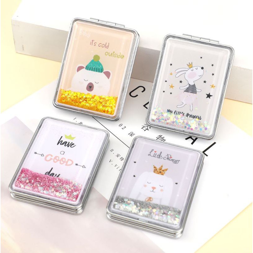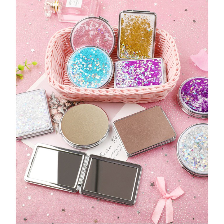 Gương trang điểm mini, gương nhũ soi được 2 mặt thiết kế vỏ kim tuyến nước lấp lánh chất lượng cao