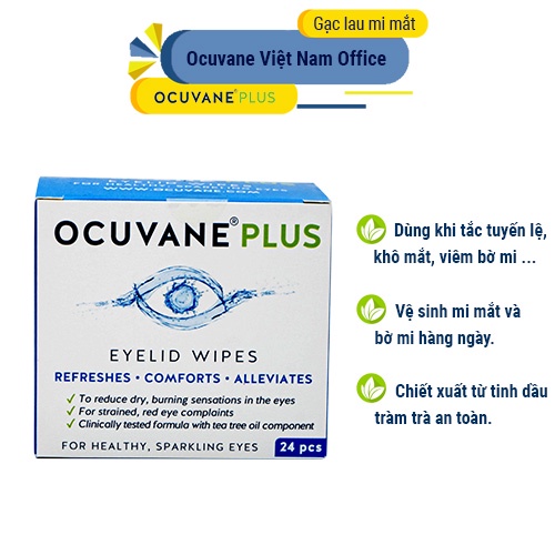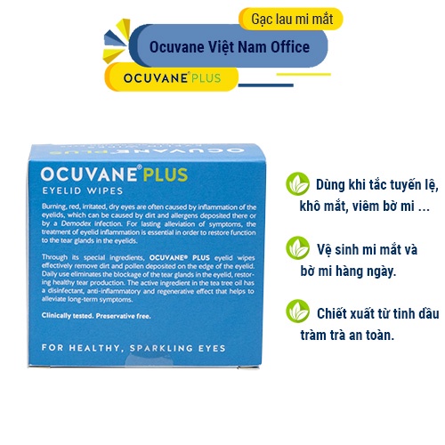 Gạc lau mi mắt Ocuvane Plus dùng cho viêm bờ mi, khô mắt, tắc tuyến lệ; vệ sinh mắt hàng ngày; chiết xuất tinh dầu trà