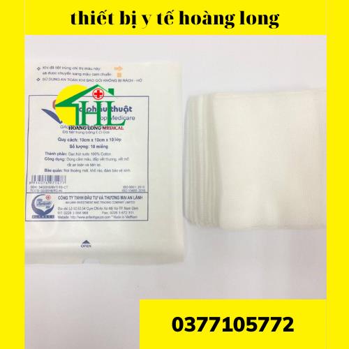 thiết bị y tế hoàng long có địa chỉ tại số nhà 38 ngách 2/2 ngõ 2 phương mai đống đa hà nội sdt: 086750018 gạc phẩu thuật tiệt trùng 10 x 10 x8 lớp AN LÀNH Công dụng của gạc phẫu thuật: Dùng cầm máu, đắp vết thương, vết mổ rất an toàn và tiện lợi. Gạc phẫu thuật được sử dụng rộng rãi trong phòng mổ của bệnh viện.Thích hợp cho các vết thương lớn, khả năng thấm hút nhanh máu và dịch tiết từ vết thương.Được sử dụng cho các vết rạch, vết cắt dài trong quá trình phẫu thuật.Mô tả chi tiết & Hướng dẫn ử dụng:Được làm từ 100% sợi cotton.Sản xuất theo tiêu chuẩn Dược Điển Việt Nam.Có hoặc không có sợi cản quang (tùy theo nhu cầu khách hàng).Khả năng thấm hút cao và nhanh.Mịn màng, mềm mại, không gây kích ứng da.Được may bốn góc và có dây quai.Thân thiện môi trường, gạc trắng và sạch.Bảo quảnNơi khô ráo, thoáng mát.HSD:Quy cách đóng góiTúi 10 cái.5000 miếng/Kiện