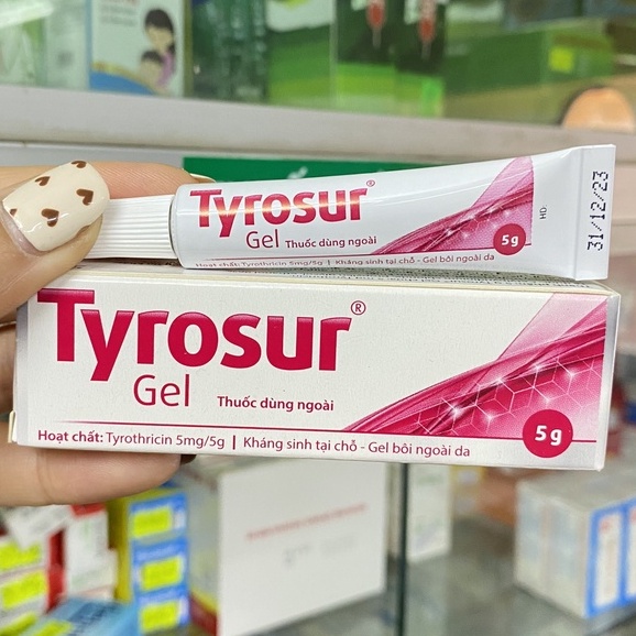 Sản Phẩm Không Phải Là Thuốc KHông Thể Thay Thế Thuốc CHữa Bệnh. Hoạt chất: Tyrothricin Cách đóng gói: Hộp 1 tuýp x 5g Dạng bào chế: Gel bôi Công dụng: da do rách da, bỏng Số đăng kí: VN-12229-11 Thương hiệu: Engelhard Arzneimittel (Đức) Nhà sản xuất: Engelhard Arzneimittel Thành phần: Trong mỗi gamTyrosur gel chứa: Hoạt chất: Tyrothricin 0.95 - 1.05mg. Tá dược: Cetylpyridinium chloride 1 H20, propylene glycol, ethanol 96%, carbomer 40.000 - 60.000, trometamol, nước tinh khiết. Công dụng: Tyrosur gel được dùng , phòng ngừa nhiễm khuẩn đối với các vết thương nhỏ ở bề mặt da đang hoặc có nguy cơ bội nhiễm vi khuẩn nhạy cảm với Tyrothricin. Một số loại vết thương cụ thể như: - Vết cắt, vết rách da nhỏ ít chảy máu. - Vết bỏng. - Phồng hoặc trầy xước da. - Nốt phát ban bội nhiễm. - Viêm da, lỗ chân lông có mủ. - Vết chỉ khâu hoặc nốt xăm thẩm mỹ. Liều dùng: Chỉ dùng ngoài da. Liều thông thường: mỗi lần với lượng vừa đủ, 2 - 3 lần mồi ngày.