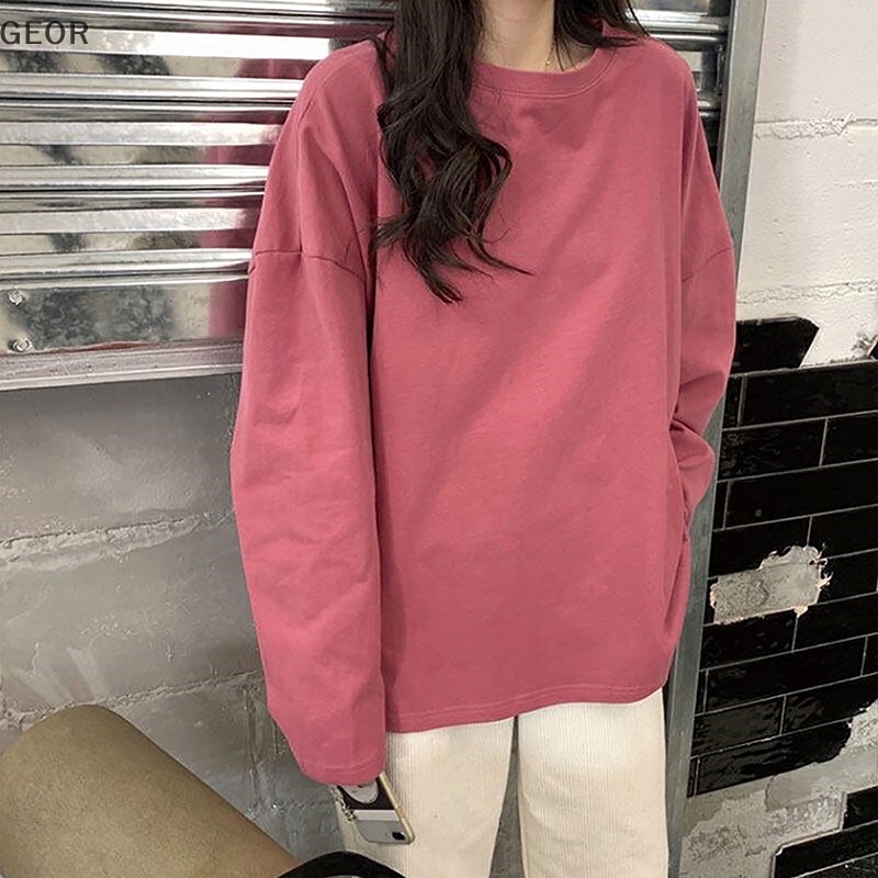 Geor Áo Thun Tay Dài Cổ Tròn Dáng Rộng Màu Trơn Thời Trang Mùa Thu Phong Cách Hàn Quốc Cho Nữ