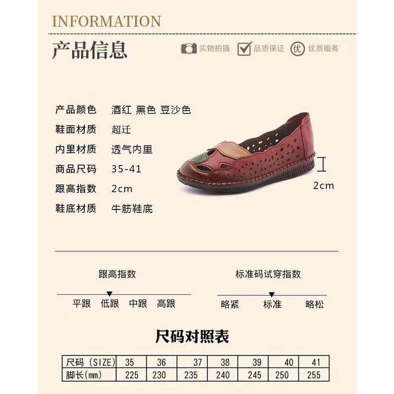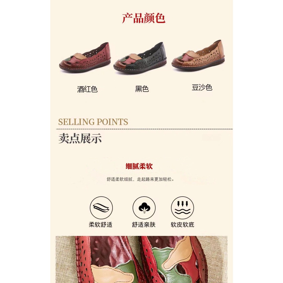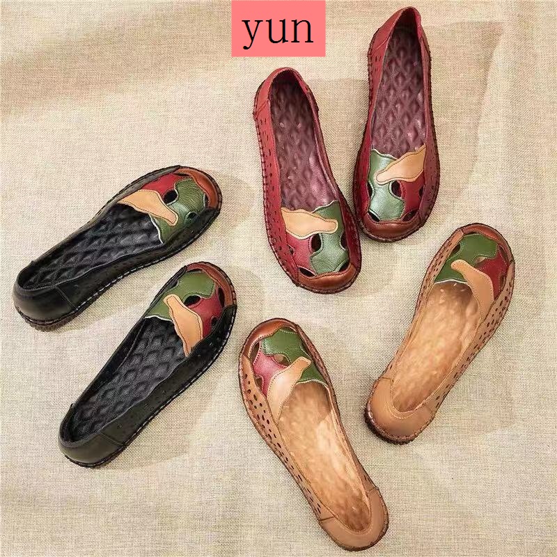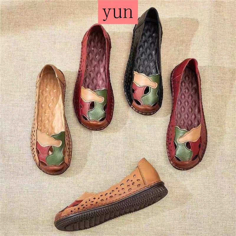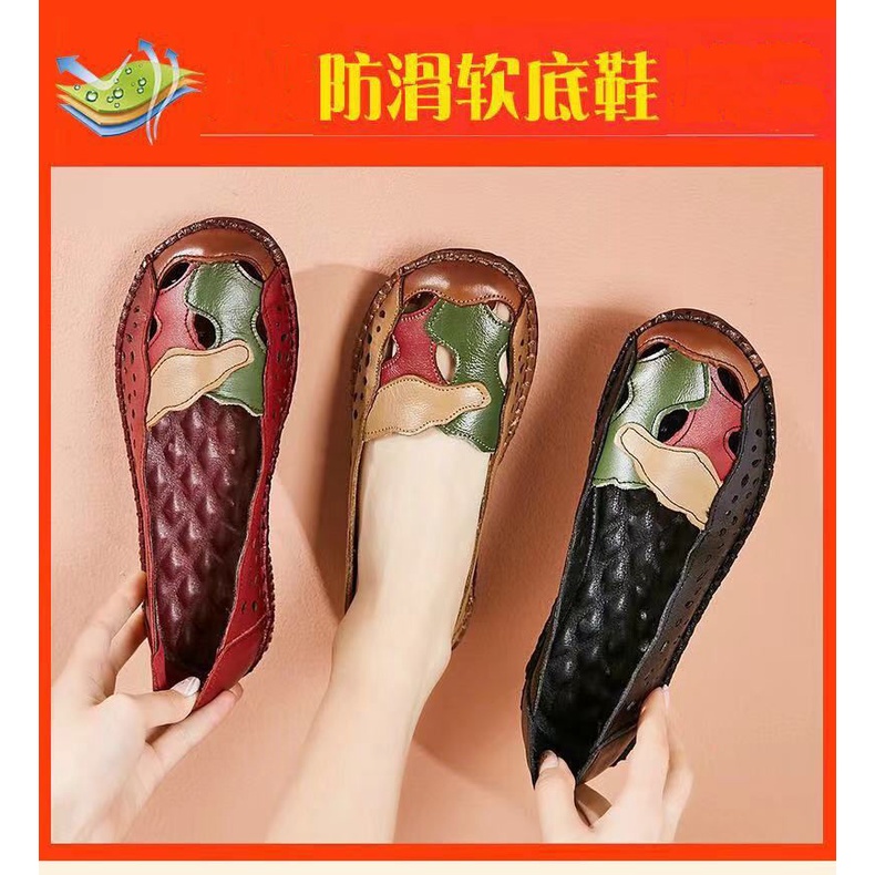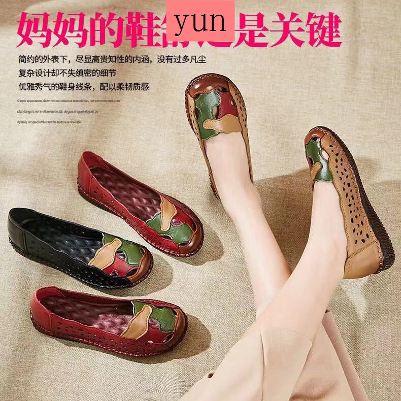 Chạy màu đỏ mùa hè mẹ dép đế bò chống trơn trượt đế gân mềm da rỗng kích thước lớn lỗ giày đế phẳng phong cách dân tộc giày đơn phụ nữ #Giày nữ #Giày bệt #Giày lười & giày thuyền buồm