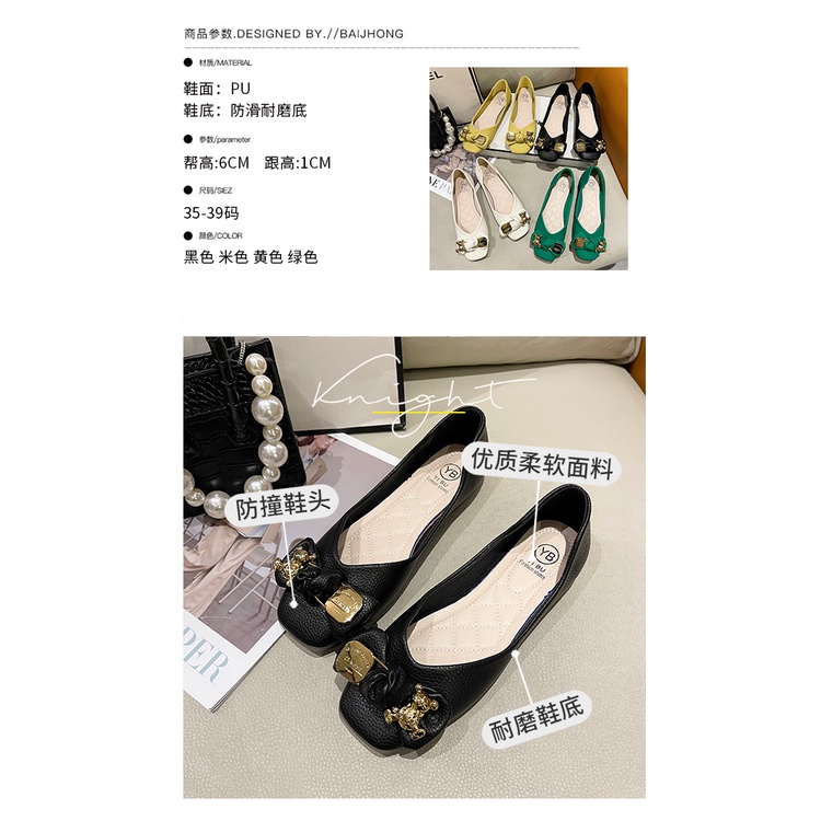 Giày Búp Bê Mũi Vuông Gót Thấp Miệng Nông Đính Nơ Bằng Kim Loại Thời Trang Mùa Thu Dễ Thương Ngọ