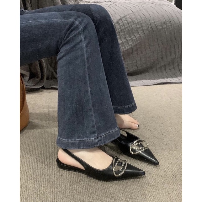 Giày nữ sandal mũi nhọn đế bệt quai ngang đá chun sườn chất da mờ êm mềm