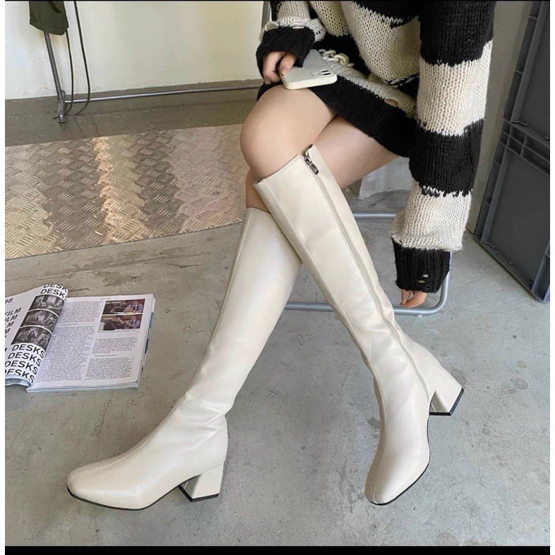 Giày bốt đùi mũi tròn form đứng tôn dáng , Bốt nữ cao cổ da trơn đế vuông cao 5p siêu sang chảnh