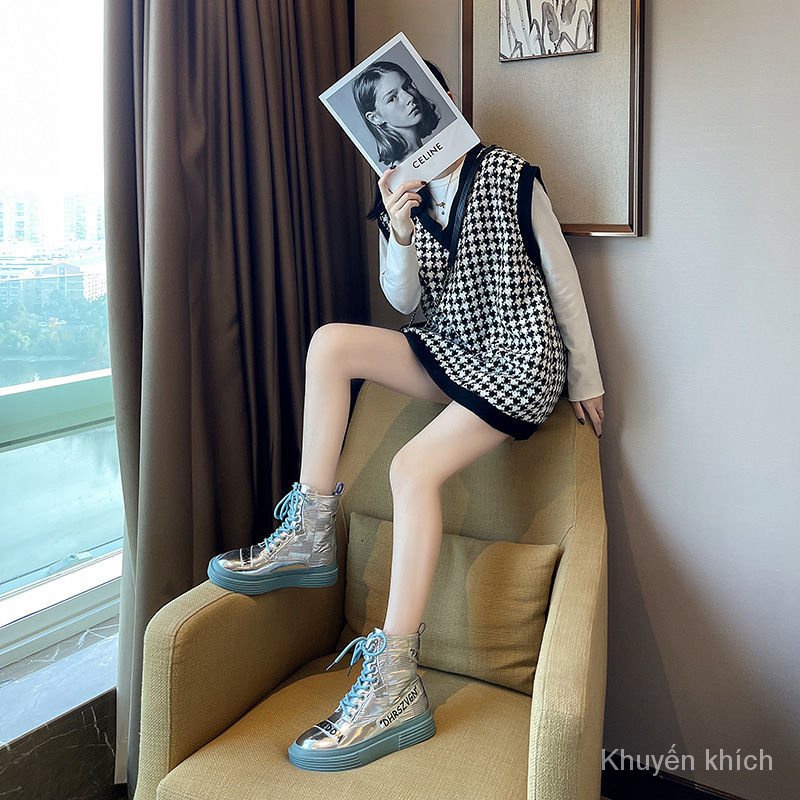Giày bốt cổ ngắn da bóng đế bằng dày dặn thời trang dành cho nữ