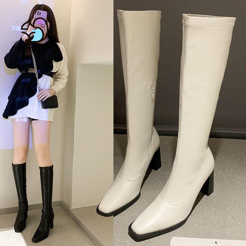 Giày Bốt Cao Gót Cổ Cao Qua Gối Màu Trắng Sữa Co Giãn Thời Trang Cho Nữ