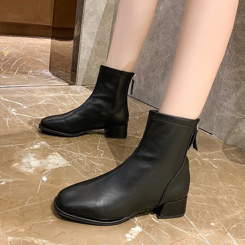 Giày bốt IELGY màu đen cổ thấp dễ dàng mang kiểu martin có dây kéo đế dày trung bình chất liệu da PU