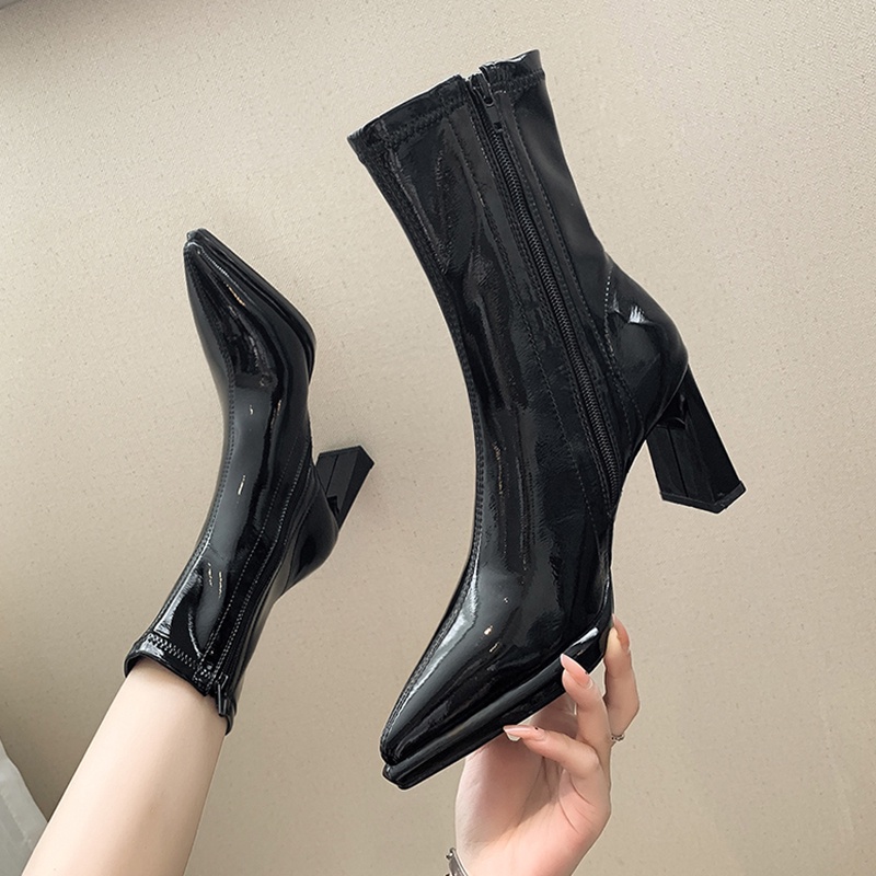 Giày bốt Martin vải da bóng mũi nhọn cao gót phong cách mới 2022 dễ phối đồ