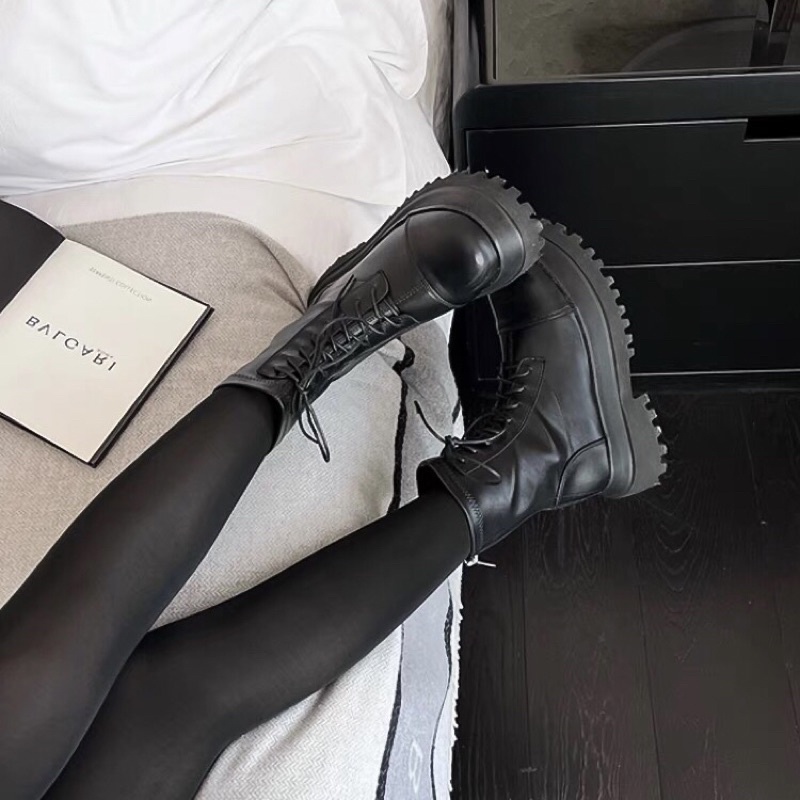 ~ Giày Bốt Cao Đến Đầu Gối Đế Dày Buộc Dây Màu Đen Mùa Thu Dễ Phối Đồ Cho Nữ
