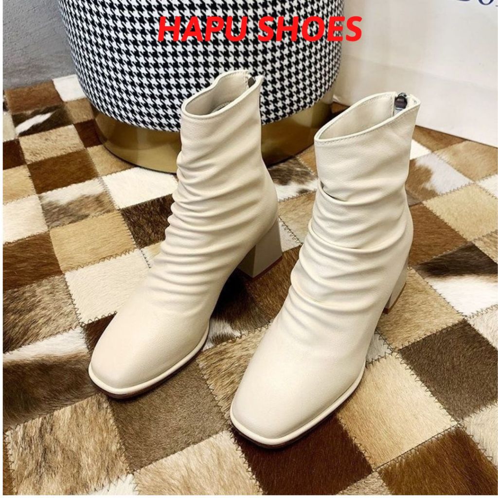 Giày boot nữ cổ ngắn mũi vuông gót tràn viền thời trang cao cấp - Bốt nữ cao 5cm da si mềm bao đẹp