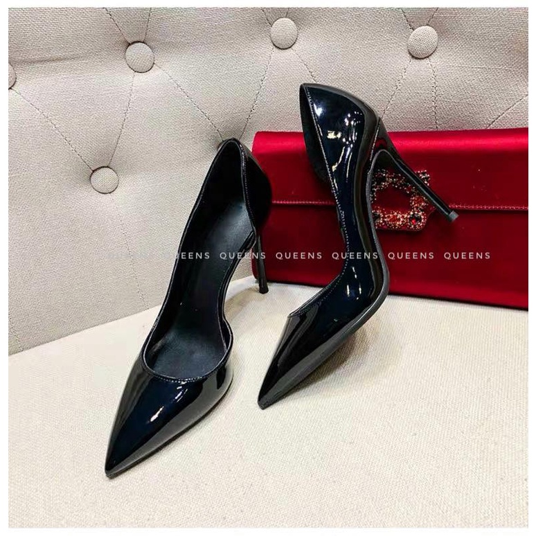 Giày Cao Gót Mũi Nhọn Nữ 8-10-11 phân Hở Eo Sang Trọng Nữ Tính, Dễ Mang, Chất Liệu Êm Ái Bảo Hành 1 Năm - Đen Bóng