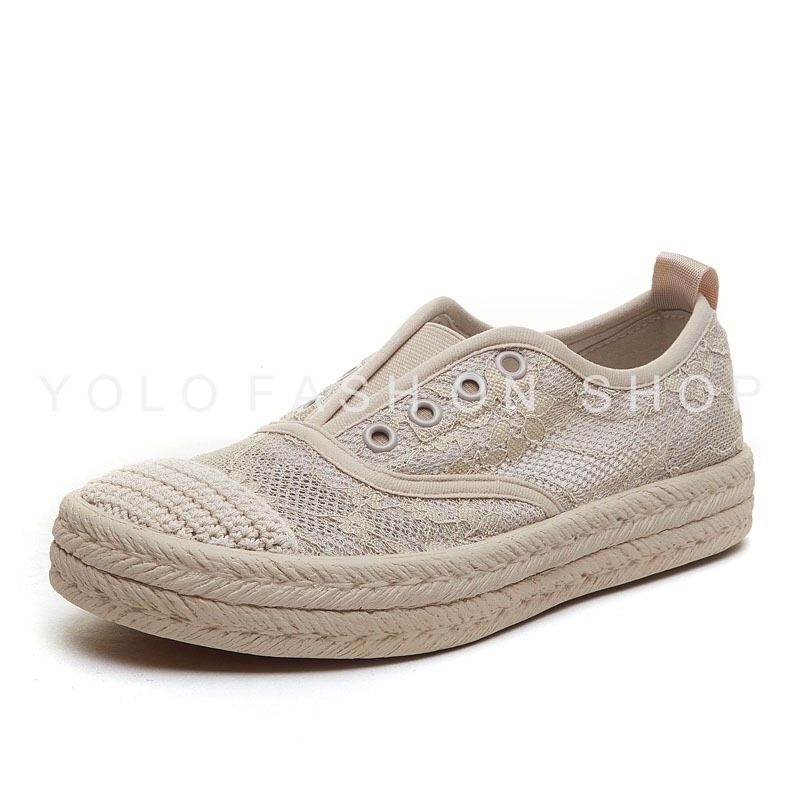 Slip on - Giày lười vải nữ đế bằng phong cách HQ - Chất liệu vải ren, đế cao su viền cói - Mã 686