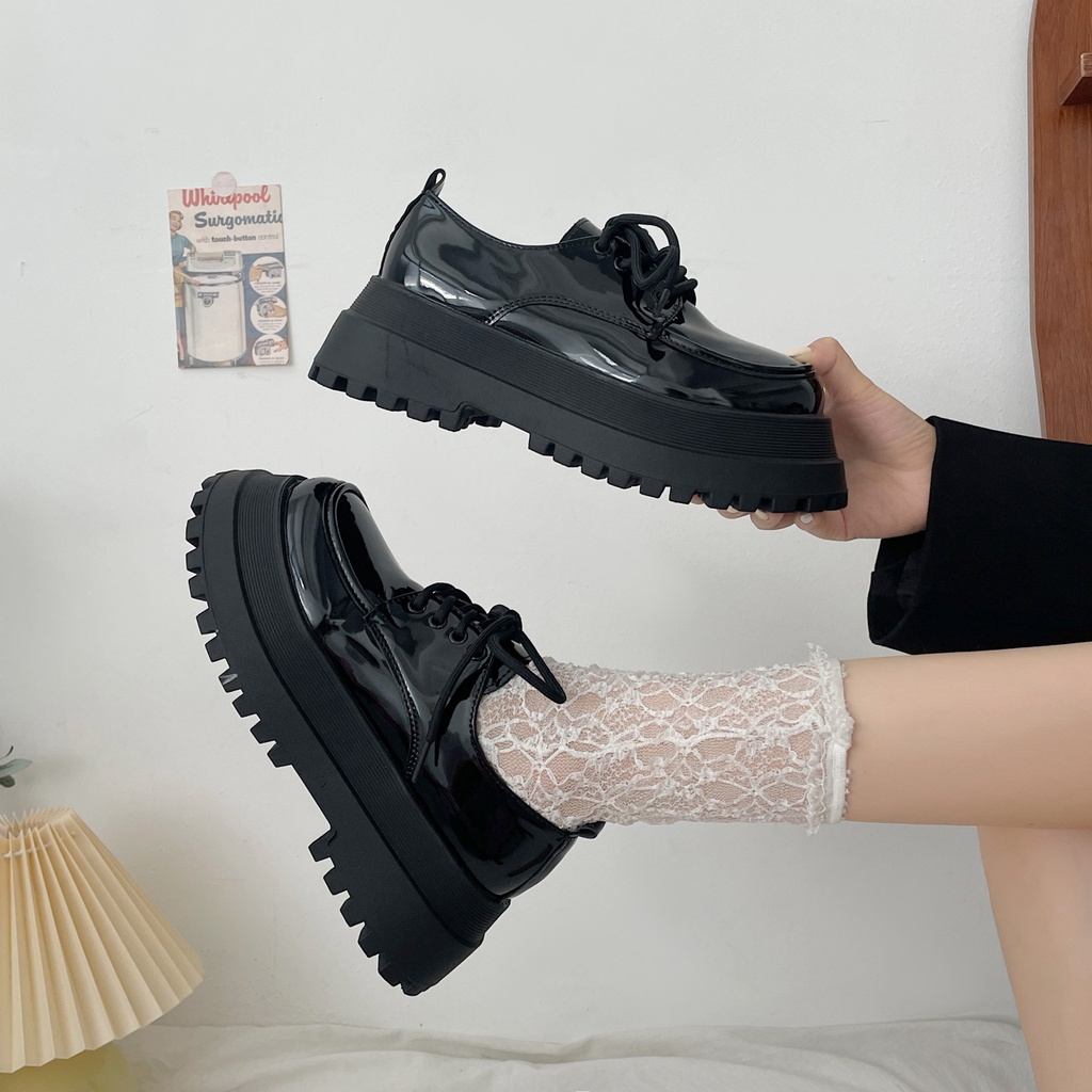Giày Nữ Da Bóng, Đốc Nữ oxford Dây Buộc đế răng cưa tăng chiều cao 2 màu đen trắng