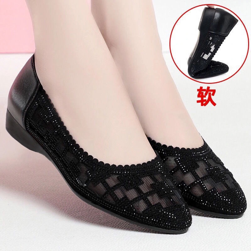 Giày Sandal Da Mềm Đế Bằng Chống Trượt Phối Lưới Thời Trang Cho Phụ Nữ Trung Niên