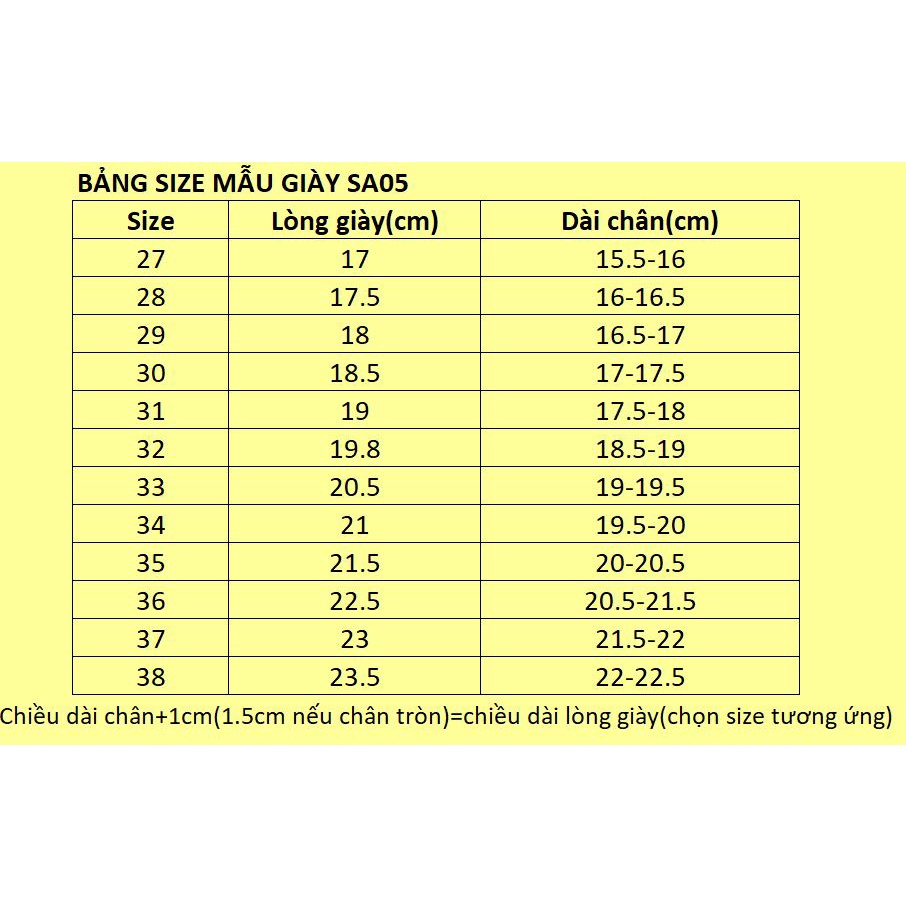 Giày sandal elsa bé gái SA05 xinh xắn với họa tiết hoạt hình elsa sắc nét, sinh động là thần tượng của nhiều bé gái độ tuổi mầm non, tiểu học. Màu sắc phối dịu nhẹ, tinh tế rất dễ mix nhiều kiểu quần áo thời trang cho bé đi chơi, đi học, đi biển hay tham gia các hoạt động ngoài trời . Chất liệu da kết hợp đế cao su nhẹ êm, có độ bám tốt. Đặc biệt thiết kế giày với cả 2 quai dán có thể điều chỉnh giày ôm chân hỗ trợ bé vận động tối đa. Size: 27-38 Màu: hồng Chất liệu: da Đế cao su mềm êm, ma sát cao Xuất xứ: Trung Quốc xuất khẩu BẢNG SIZE - Size 27 tương ứng chiều dài lòng giày 17cm - Size 28 tương ứng chiều dài lòng giày 17.5cm - Size 29 tương ứng chiều dài lòng giày 18cm - Size 30 tương ứng chiều dài lòng giày 18.5cm - Size 31 tương ứng chiều dài lòng giày 19cm - Size 32 tương ứng chiều dài lòng giày 19.8cm - Size 33 tương ứng chiều dài lòng giày 20.5cm - Size 34 tương ứng chiều dài lòng giày 21cm - Size 35 tương ứng chiều dài lòng giày 21.5cm - Size 36 tương ứng chiều dài lòng giày 22.5cm - Size 37 tương ứng chiều dài lòng giày 23cm - Size 38 tương ứng chiều dài lòng giày 23.5cm ☑️ HƯỚNG DẪN ĐO CHÂN ĐỂ CHỌN SIZE GIÀY Bước 1: Bạn đặt tờ giấy vào phía dưới lòng bàn chân Bước 2: Đánh dấu 2 điểm xa nhau nhất là gót chân và đầu ngón chân dài nhất vào tờ giấy Bước 3: Xác định chiều dài chân ➡️ Bạn dùng thước kẻ đo chiều dài giữa 2 điểm vừa đánh dấu trên giấy. ➡️ Kích thước đo được là chiều dài chân (tính theo cm) Để xác định size giày chuẩn xác cho bé thì điều cần thiết là đo chiều dài chân chính xác. Sau đó, bạn lấy chiều dài chân đo được cộng thêm 1cm hoặc cộng thêm 1.5cm nếu chân bé dày bề ngang (mu bàn chân tròn hoặc bề ngang bàn chân to) là ra số đo chiều dài lòng dày phù hợp. So chiều dài lòng giày với bảng size giày ở trên thì xác định được size giày chuẩn xác cho bé rồi. 👉 Lưu ý: Phương Store có chính sách đổi size (hết size được đổi mẫu, tiền chênh lệch sẽ được hoàn/ thu thêm) sau 5 ngày nhận hàng. Tuy nhiên, để hạn chế việc đổi trả mất thời gian chờ đợi cũng như chi phí ship lui tới thì Quý phụ huynh vui lòng đo chân con trước khi chọn size giày. Vì mỗi mẫu giày có khi chênh lệch nhau 1 - 2 size. Việc chọn size giày dựa vào mẫu giày cũ đôi khi không được chính xác. Thông tin liên hệ của Phương Store: 🏠 54/1 Nam Lân, Bà Điểm, Hóc Môn, TPHCM ☎ Hotline: 0971927804 🌐Website: https://phuongstore.vn/ #giaybegaidihoc #giaysandalbegai #giaysandalchobegai #giayelsa #depquaihaubegai #sandalbegai